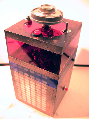 Math03 was built after the first Math, and simultaneously with Mathindex. (If you've already built one, building two more is easy!). It features silver, bronze, and black spray paint splatter on a silver base. The big silver knob is neat, and the human contact resistance point is a steel cap. This gadget warbles and whines for hours...