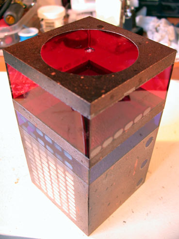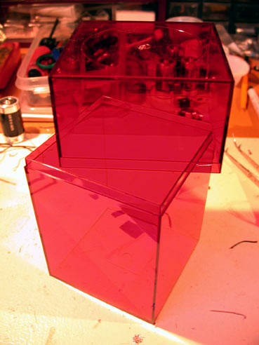 | Red acrylic box (from The Container Store). In the final versions, I swapped blue and red lids. ------------------> |