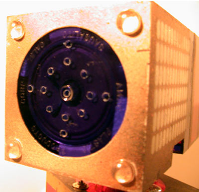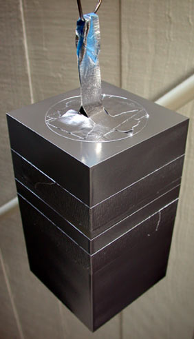Math03 with finished paint job, utilizing stencils (the aluminum cover from a 1st generation iMac's RAM and processor daughtercard), and silver, bronze, and black spray paint splatter. No electronix yet inserted. Note the clear window that allows viewing of the LED display and circuitry. The circuit board had to be placed in the box diagonally to fit correctly. <------------------- |